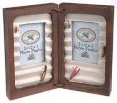 Fly Fishing FrameRemember the day the Big One got away? Crazy Uncle Eddie was so mad he "accidentally" threw his pole in the lake after it? Capture that moment or other fun moments like these forever in this lodge style, fly box themed double photo frame. This hand painted resin double photo frame will hold two 2" X 3" photos and has sturdy hinges for closing when moving or storing. Frame measures aproximately 7"w x 6"h and 3/4"d when completely open. Opening for photo has a clear glass cover. Perfect for displaying those frightfully fun fishing moments or photos of the little fish in the family doing whatever they do best. Don't let this one get away.....a great gift for that fish lover in your life.