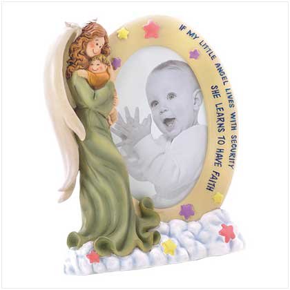 Surround your little one's precious face with the images of motherly love! A loving angel cuddles her rosy-cheeked baby girl in a touching display of a mother's heavenly love; even the stars and clouds around them dance with joy! A wonderful gift for any new mommy! Polyresin with glass photo cover. Holds a 3 1/2" x 4 1/2" photo. 6 1/2" x 1" x 7" high.
