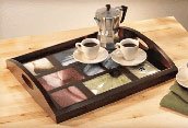 This Wood Umbra Photo Serving Tray serves up food and drinks with a personal touch. Create a terrific conversation piece when entertaining your guests by showcasing 9 of your favorite photos in a truly unique way. Espresso colored Photo Tray holds the following size photos: (4) 4" x 6" / 10 x 15 cm, (4) 4" x 4" 10 x 10 cm, (1) 3" x 4" (8 x 10 cm). Measures: 14" x 18" x 3". Serve up your memories at your next party with this unique Photo Serving Tray.