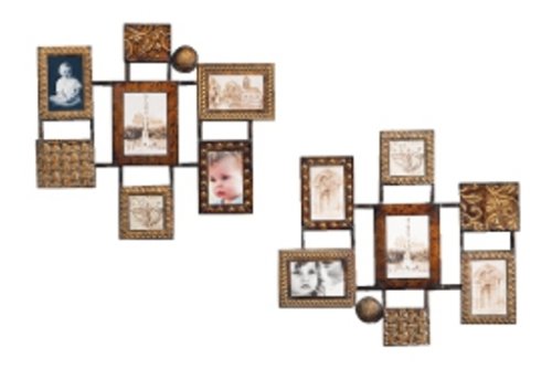 Wall Photo Holder. Grid with Embossed Design and Antique Gold Finish. Set of two coordinating designs, each holds one 5" x 7", two 4" x 6", one 6" x 4" and one 4" x 4" photo. Overall size of each is 24.5" wide, 22.25" tall. CBK Exclusive