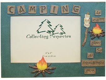 Decorative camping theme picture frame that stands horizontal. Has "Camping" written on top and a campfire on bottom and also a saying on side that says " As warm fire glow, so do friendships grow". Great gift idea. Holds a 4"x6" photo. Frame is 6x8.