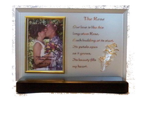 This beautiful frame holds a wallet size photo. The poem reads: The Rose... Our love is like this long stem rose, each budding at its start, its petals open as it grows, its beauty fills my heart.