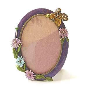 This whimsical frame features a sparkling bee and shimmering flowers. Oval frame has been crafted from fine pewter and meticulously hand enameled in a deep, iridescent, Purple-Mauve. A Three-Dimensional, hand enameled, golden Bee decorates the top of this frame, and its wings are set with lots of sparkling Swarovski Crystals for a shimmering sparkle. Three large, leafy flowers grace the bottom of the frame. They are hand enameled in hues of Pink, Green and Aqua-Blue, and their centers are set with more brilliant, Swarovski Crystals. Enchanting!