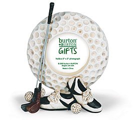 Golf Ball Shaped Picture Frame. This golf ball shaped picture frame is made of hand painted poly-resin. Holds a 3" x 3" Photo. Golf Picture frame is 6" high x 5.5" wide.
