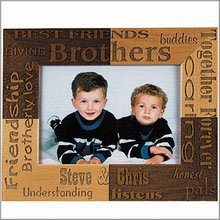Show the world how proud you are of your family! Exclusive laser-engraved natur al wood frame displays "sister" or "brother" designs around the frame. We make it extra special by personalizing it with both sisters' or brothers' names, up to 20 characters. Frame measures 8-1/4"x6-1/4" overall; holds a 3-1/2"x5" or cr opped 4"x6" photo with easel back. Choose vertical or horizontal orientation.